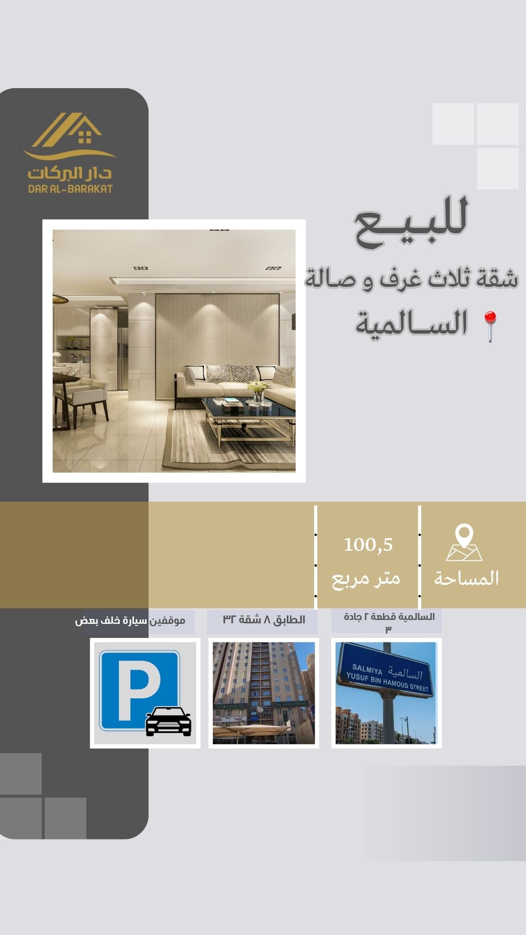 للبيع شقة ثلاث غرف وصالة فى السالمية