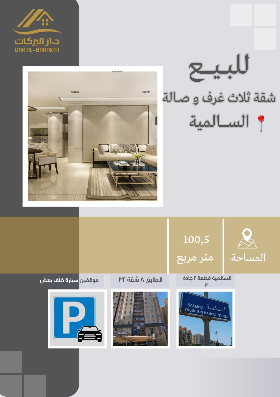 للبيع شقة سكنية ثلاث غرف وصالة تمليك وثيقة حرة السالمية ق 2 جادة 3 شارع يوسف بن حمود خلف مستشقي...
